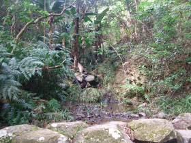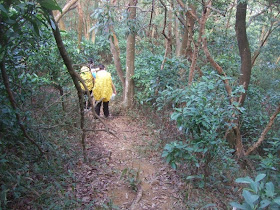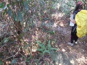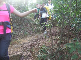 P90:大欖涌對山的群山,其一山崗高268米。教練覺得我們「很有信心」,讓男女各一小組分開走,男小組先到CP5(JK9670 8050),女小組15分鐘後抵達,原來女小組行走中亦帶點驚慌,更要打電話「報平安」呢。