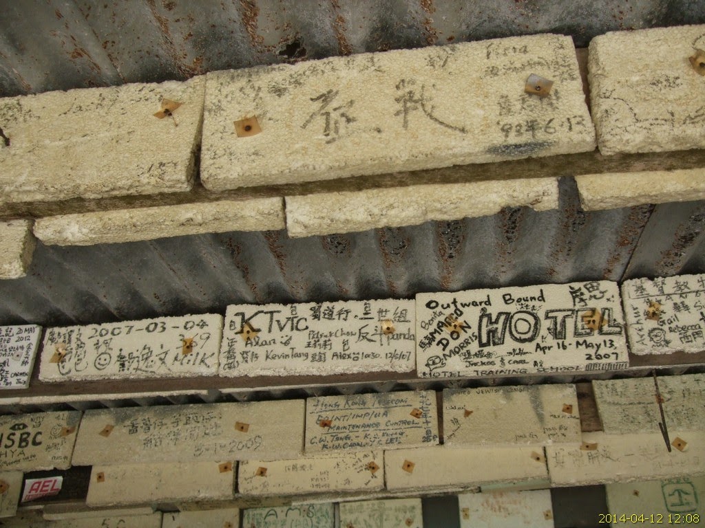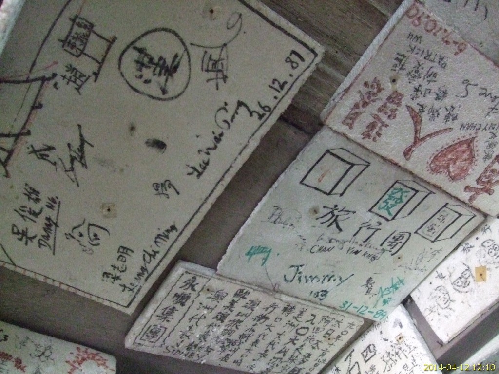P62-66:遊客在發泡膠板刻字。發泡膠板其後就釘在天花位置,可惜坳仔來得太遲,因「膠滿之患」,士多已停止提供此服務,最新一塊已是2010年左右,而最舊一塊約為1986年。