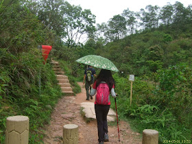 P43-44:在三椏公廁後的小路沿絲帶往牛屎湖,初段為樓梯。已拿兩根樹枝,以減少「上網」機會。
