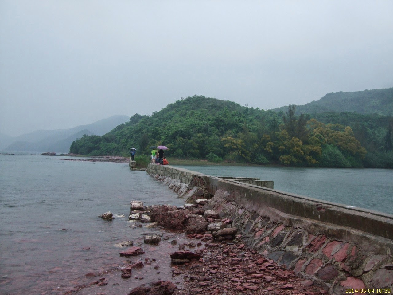 紅石門之名乃取自村旁赤紅色的石灘,因帶鐵質的岩石受氧化而成。紅石門原有小村,已廢約三十載。坳仔乃是第三次走訪紅石門,前兩次循陸路前往,天色當然不差。雨天下循水路到訪,與好天下循陸路到訪,景色、感受大為不同。未知是雨天還是潮汐緣故(註:當天於正午十二時潮漲,高度只是2米整),內湖與海峽間水位很高,堤壩偶有積水,靠近盪排頭一端更埋在水中,安全第一,團友當然不會冒險。遊覽廢屋、堤壩及海岸後,隨即經小艇返回遊船,到鴨洲去。