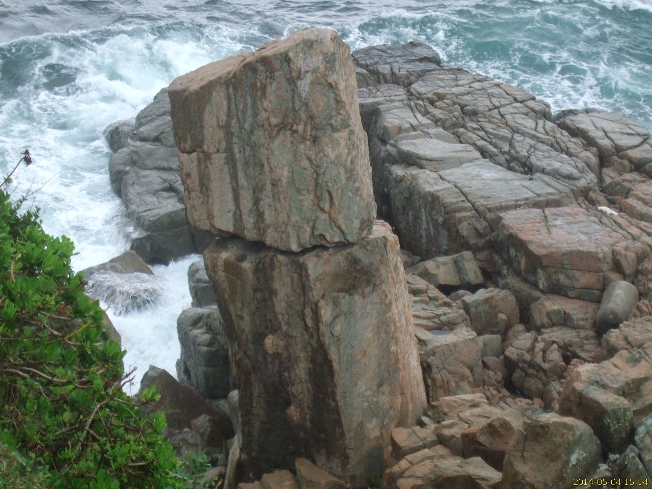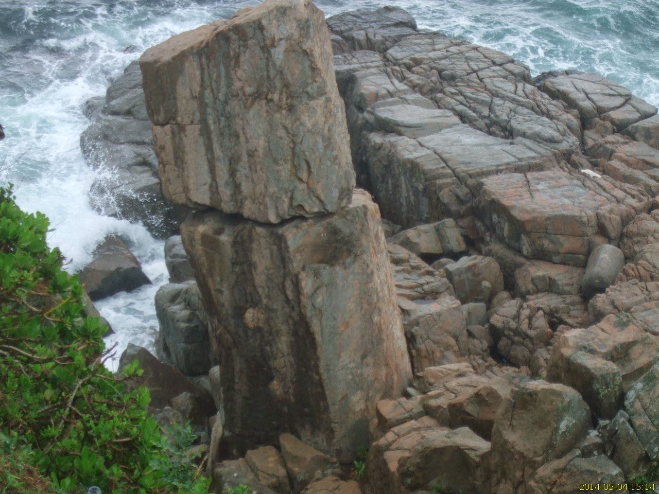 P35-37:鬼手岩及後面的兩個小海蝕洞,岩上的石壁,顏色顯得赤紅。