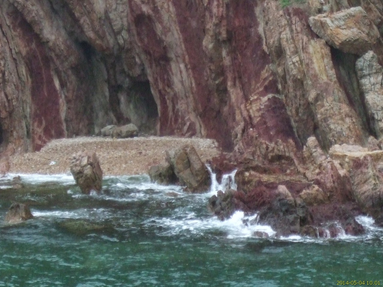 轉入黃竹角海,海面漸趨平靜。穿過烏洲塘附近,就到紅石門海岸。紅石門為一海峽,分隔紅石門村及往灣洲,最窄處寬度不足一百米。因紅石門村沒有碼頭,遊船在火紅海岸停岸,將會擱淺,故另雇兩艘小艇,來回接載團友,大家都等了十來分鐘。