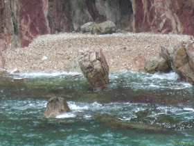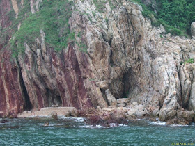 P35-37:鬼手岩及後面的兩個小海蝕洞,岩上的石壁,顏色顯得赤紅。