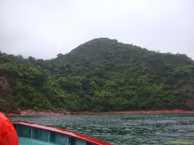 轉入黃竹角海,海面漸趨平靜。穿過烏洲塘附近,就到紅石門海岸。紅石門為一海峽,分隔紅石門村及往灣洲,最窄處寬度不足一百米。因紅石門村沒有碼頭,遊船在火紅海岸停岸,將會擱淺,故另雇兩艘小艇,來回接載團友,大家都等了十來分鐘。