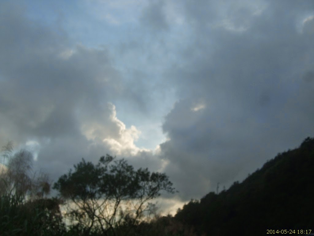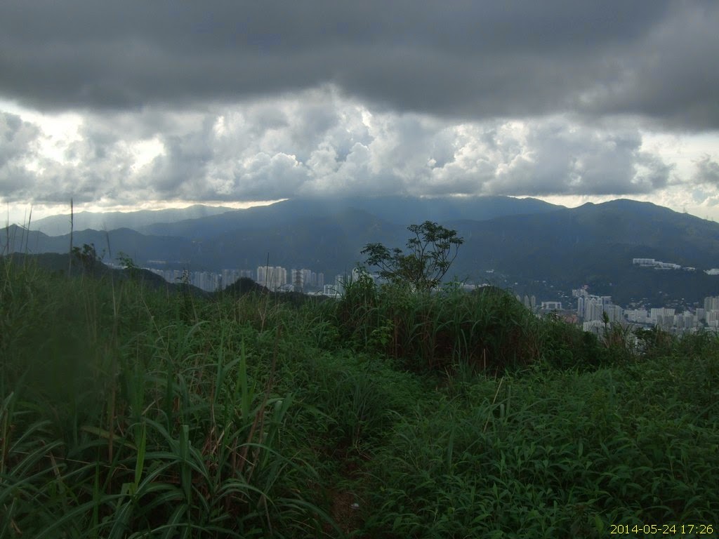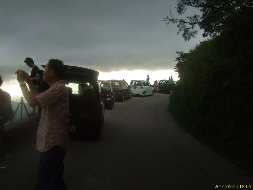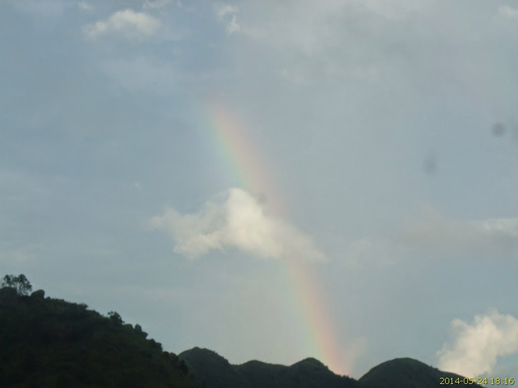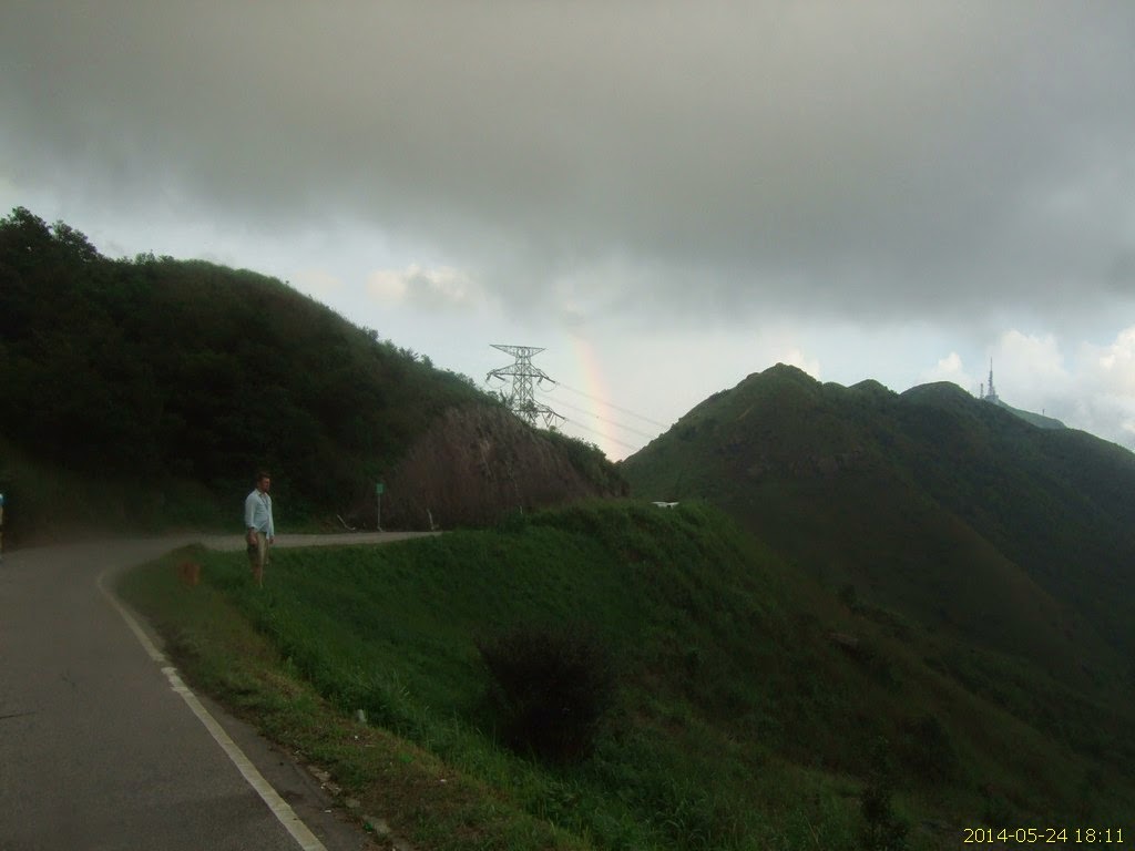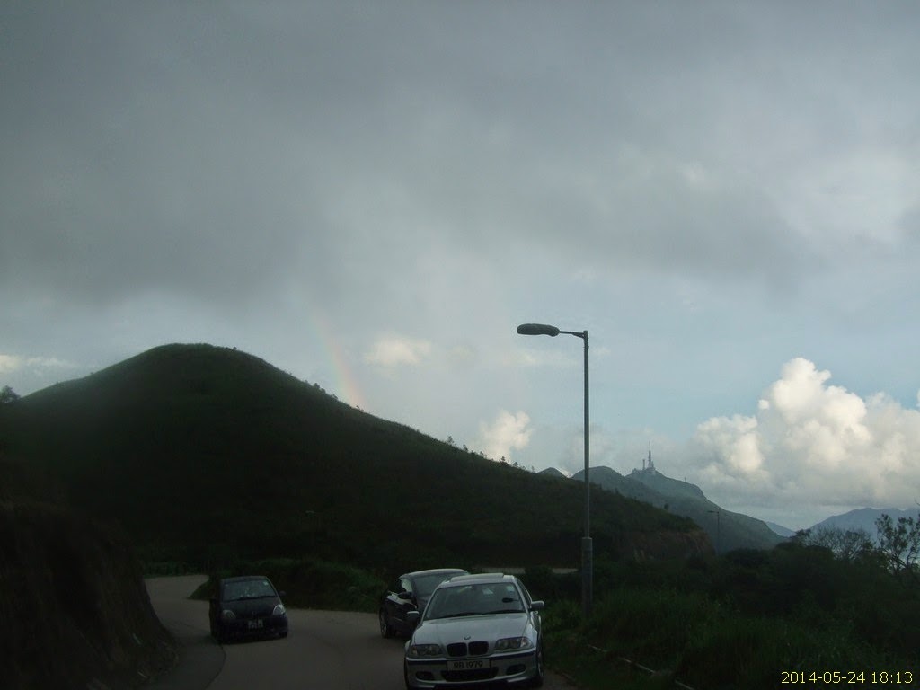)持續三星期的雷雨天氣幾近尾聲,久違的藍天終於出現,惟天氣還未算穩定,間有雷陣雨。原訂於沙田花心坑回程,但在基維爾營附近得知雷暴警告幾分鐘前發出,「被迫」與一班山友改上大老山。大老山上空曾出現大片烏雲,更有零星驟雨,為時數分鐘,幸附近沒有閃電,東面更有彩虹,遊人紛紛拍攝。