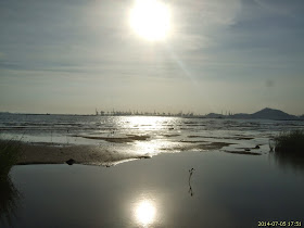 P144:站在石堤上觀日落。堆填區寫字樓,把夕陽猛烈的反射開。