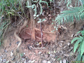 P75-76:這裡野豬很多,「動土」及挖食痕跡明顯(留意上面的大樹)。在此開始起步時,就聽到山下傳來動物在樹叢間活動的巨響。