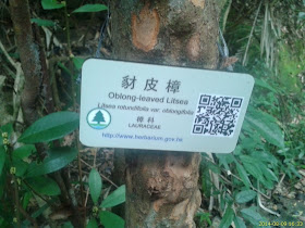 P8:這段與樹木研習徑重疊。在資訊科技發達的年代,漁護署只把刻上樹木名字,詳細介紹則要掃瞄右邊的「QR碼」,上網查閱。