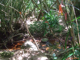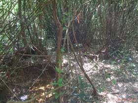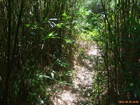 P213:回望正路(過了馬尿河的左方小路)。如由下苗田經迷椏走廊往紅石門,在此路口不可直行,要先穿越馬尿河,前走一會即看見一些鳳尾竹叢。