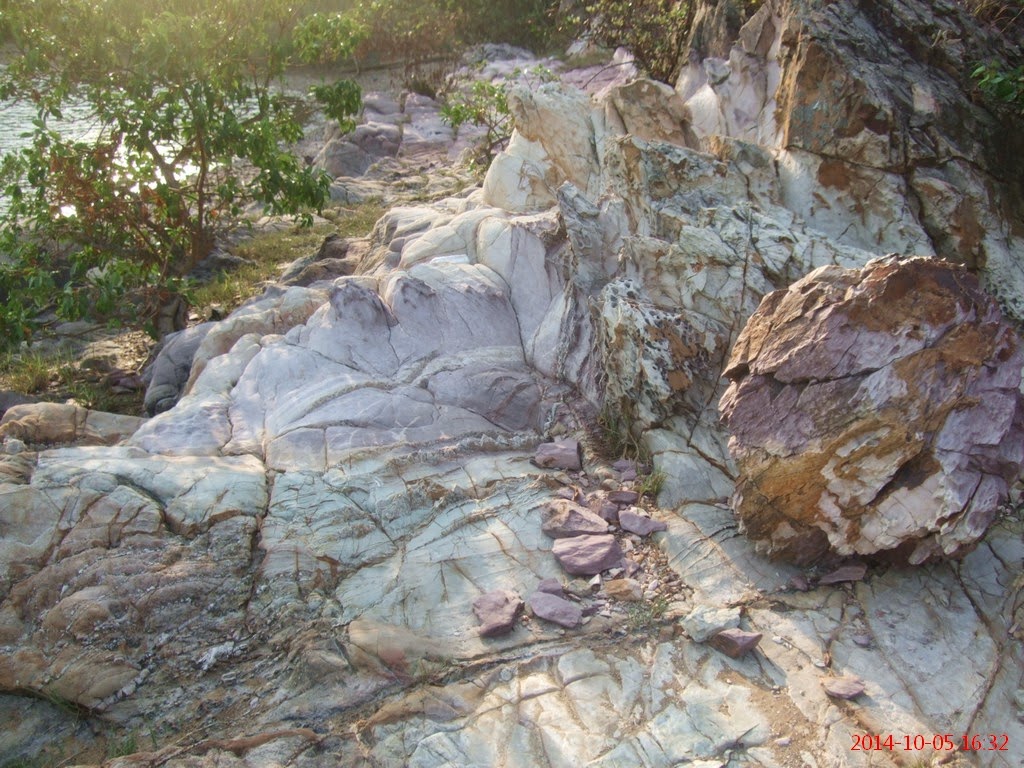 在荔枝窩小休一會,經過岸邊紅樹林步道後,左轉至一堤圍,隨即開始綑邊之旅。荔枝窩至磨刀坑一段,岸邊盡是色彩繽紛、紋理豐富的岩石,石面也頗為平滑,看中眼裡,十分舒服,故被稱作「黃金海岸」。磨刀坑位處涌灣旁,其名字源由,或因附近的岩石坑紋似被刀磨過吧,那裡原有一村,但應在更早年已荒廢,位處「慶春約」小灘及牛屎湖村之間,但約中無「磨刀坑」之名,連明顯村落遺跡都找不著。再沿岸邊,經兩岬角,兩角相對,西為涌灣咀,東為了哥岩。到達了哥岩,旁有一片岩壁,但當時陽光直射,未能看清該壁,莫非岩壁形狀似了哥?或附近有了哥狀的岩石?隨即深入牛屎湖灣,地上即有零星略帶「屎色」與形似「牛屎」的石頭「迎接」,就在牛屎湖村乾糧大休吧。