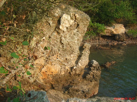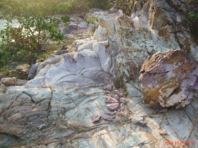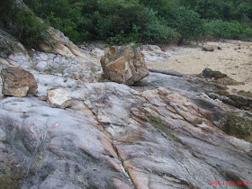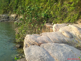 在荔枝窩小休一會,經過岸邊紅樹林步道後,左轉至一堤圍,隨即開始綑邊之旅。荔枝窩至磨刀坑一段,岸邊盡是色彩繽紛、紋理豐富的岩石,石面也頗為平滑,看中眼裡,十分舒服,故被稱作「黃金海岸」。磨刀坑位處涌灣旁,其名字源由,或因附近的岩石坑紋似被刀磨過吧,那裡原有一村,但應在更早年已荒廢,位處「慶春約」小灘及牛屎湖村之間,但約中無「磨刀坑」之名,連明顯村落遺跡都找不著。再沿岸邊,經兩岬角,兩角相對,西為涌灣咀,東為了哥岩。到達了哥岩,旁有一片岩壁,但當時陽光直射,未能看清該壁,莫非岩壁形狀似了哥?或附近有了哥狀的岩石?隨即深入牛屎湖灣,地上即有零星略帶「屎色」與形似「牛屎」的石頭「迎接」,就在牛屎湖村乾糧大休吧。