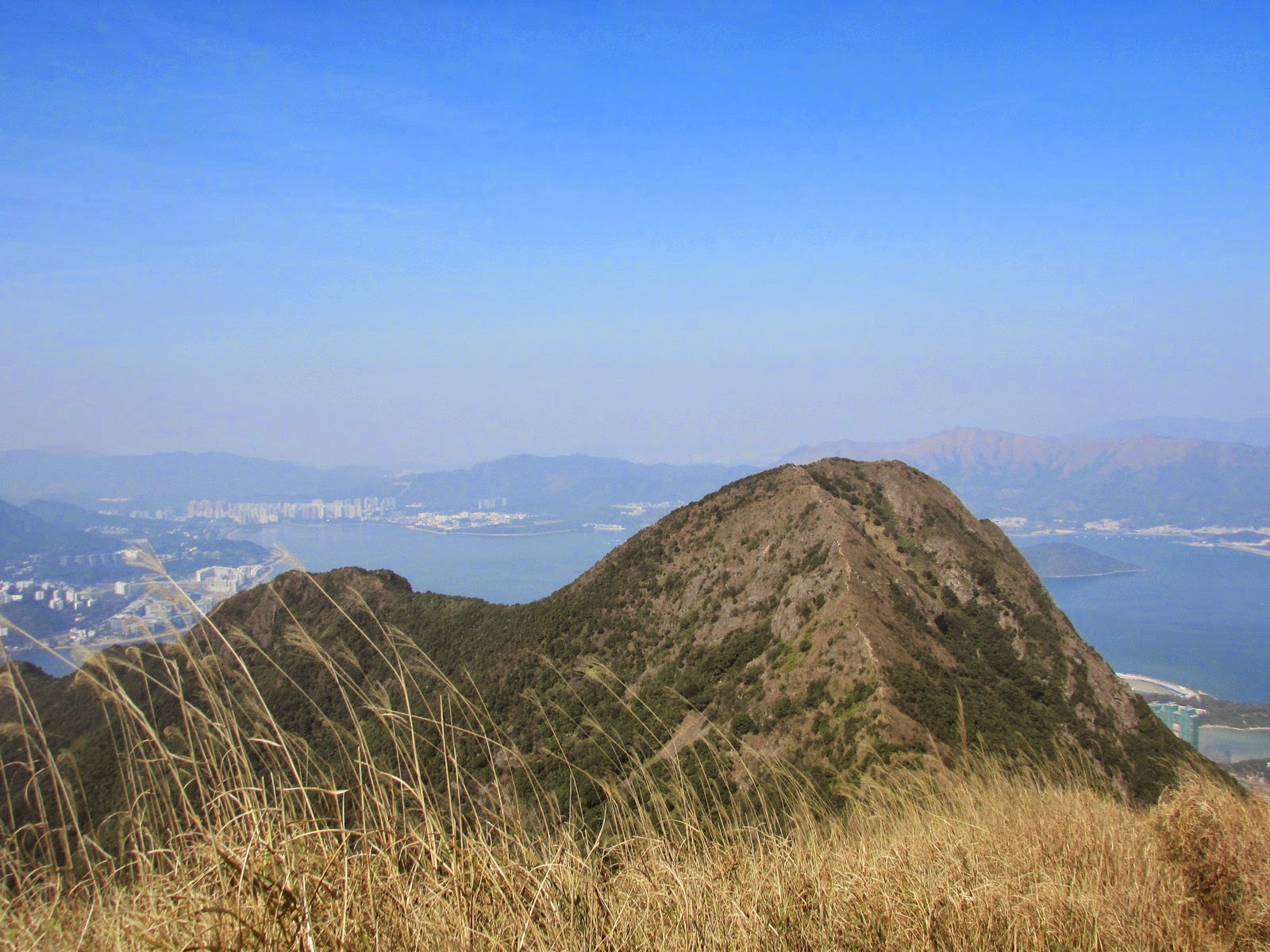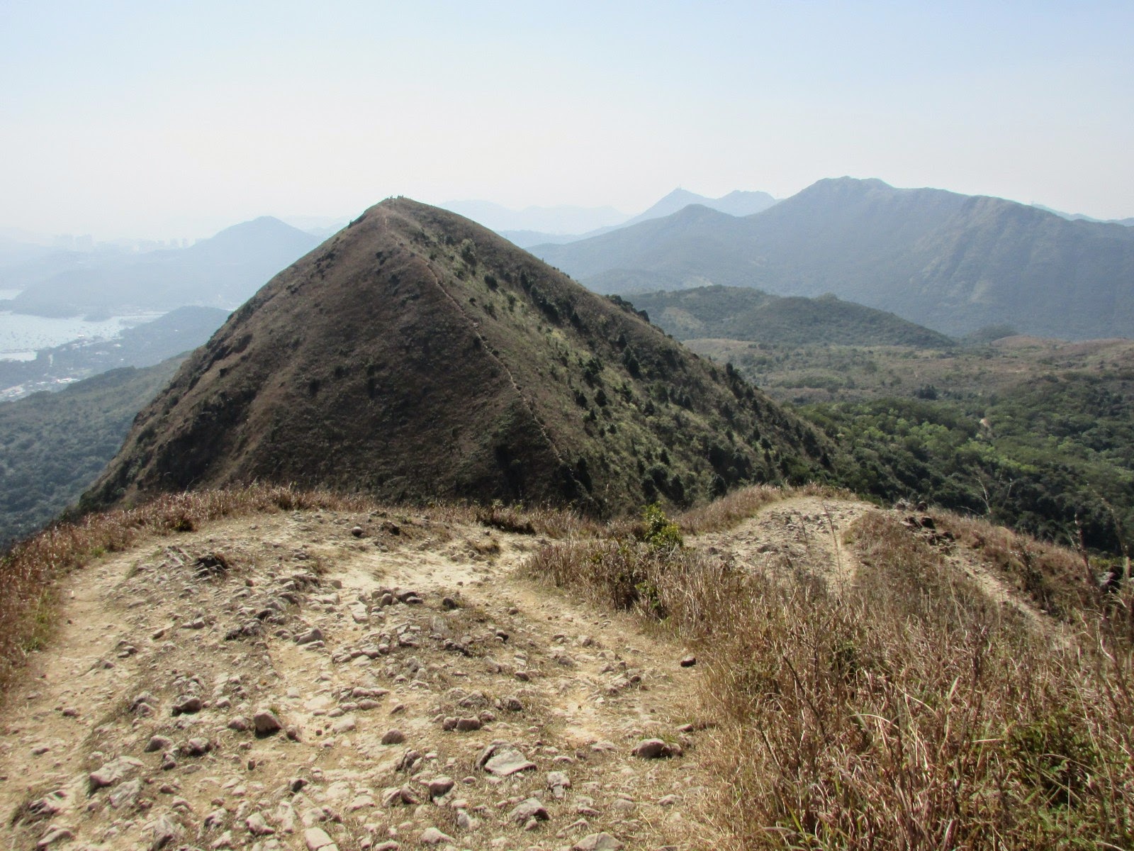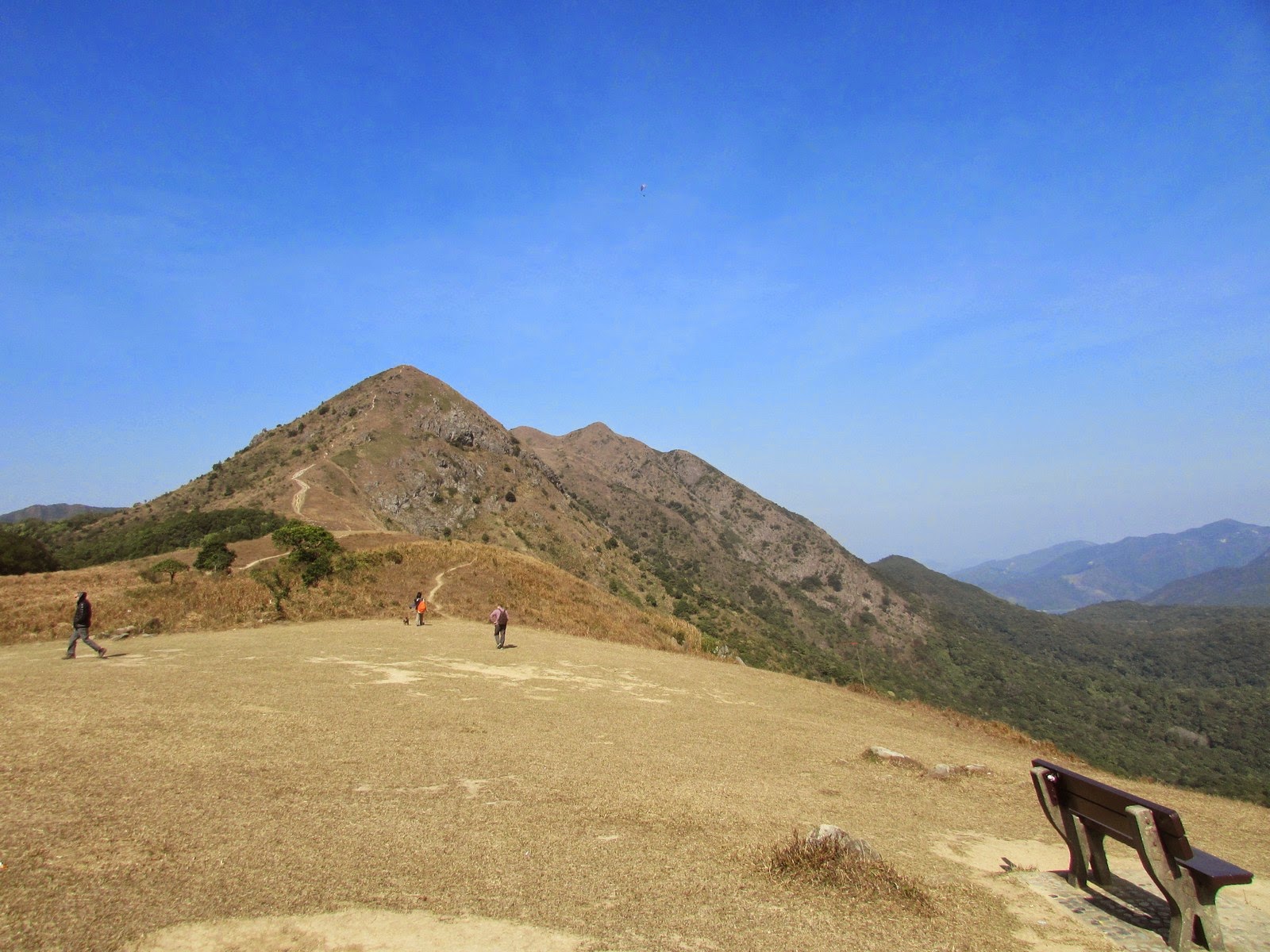 先在山頂大休一會,小休後接入麥徑,沿途見多個「懸崖危險」警告牌,代表我們正在崖頂上通過。不久後上走大金鐘頂,山體呈金字塔形及鐘形,每面斜度幾乎均等,故英文名稱之Pyramid Hill。乾爽天氣下,快速的從北脊抵達山頂,可寧靜而悠閒地欣賞西貢區、昂平高原及沙田新市鎮的景色--而另一邊的「大金鐘」,人們正忙於辦公、趕於用膳,心情亦不太佳,兩地「人文」可謂成一大對比。賞景過後,沿稍多碎石的南脊下降至昂平高原。縱使是平日,高原上仍有數十人聚集,更有少量遊人在玩滑翔傘。
