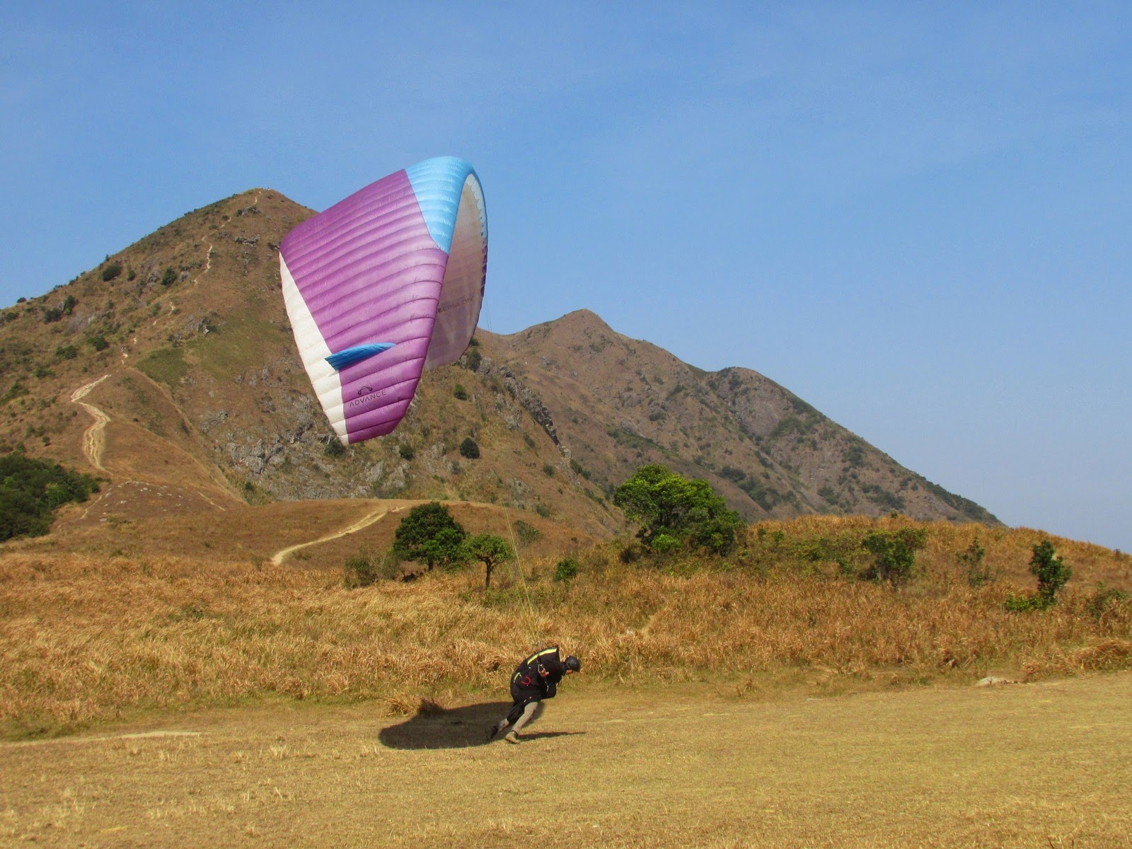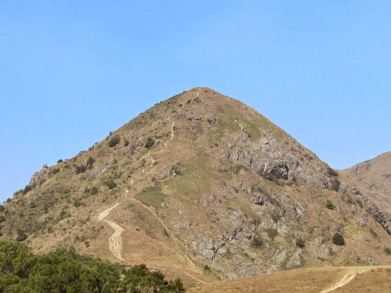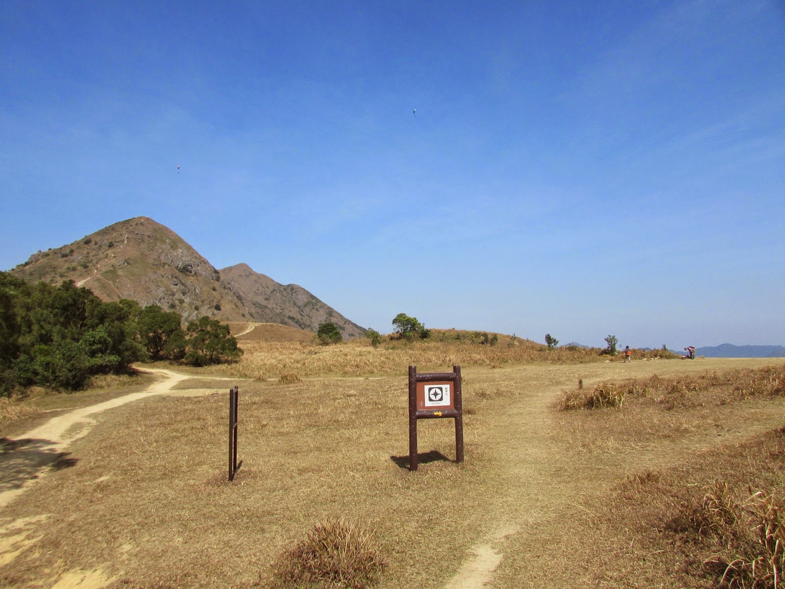 先在山頂大休一會,小休後接入麥徑,沿途見多個「懸崖危險」警告牌,代表我們正在崖頂上通過。不久後上走大金鐘頂,山體呈金字塔形及鐘形,每面斜度幾乎均等,故英文名稱之Pyramid Hill。乾爽天氣下,快速的從北脊抵達山頂,可寧靜而悠閒地欣賞西貢區、昂平高原及沙田新市鎮的景色--而另一邊的「大金鐘」,人們正忙於辦公、趕於用膳,心情亦不太佳,兩地「人文」可謂成一大對比。賞景過後,沿稍多碎石的南脊下降至昂平高原。縱使是平日,高原上仍有數十人聚集,更有少量遊人在玩滑翔傘。