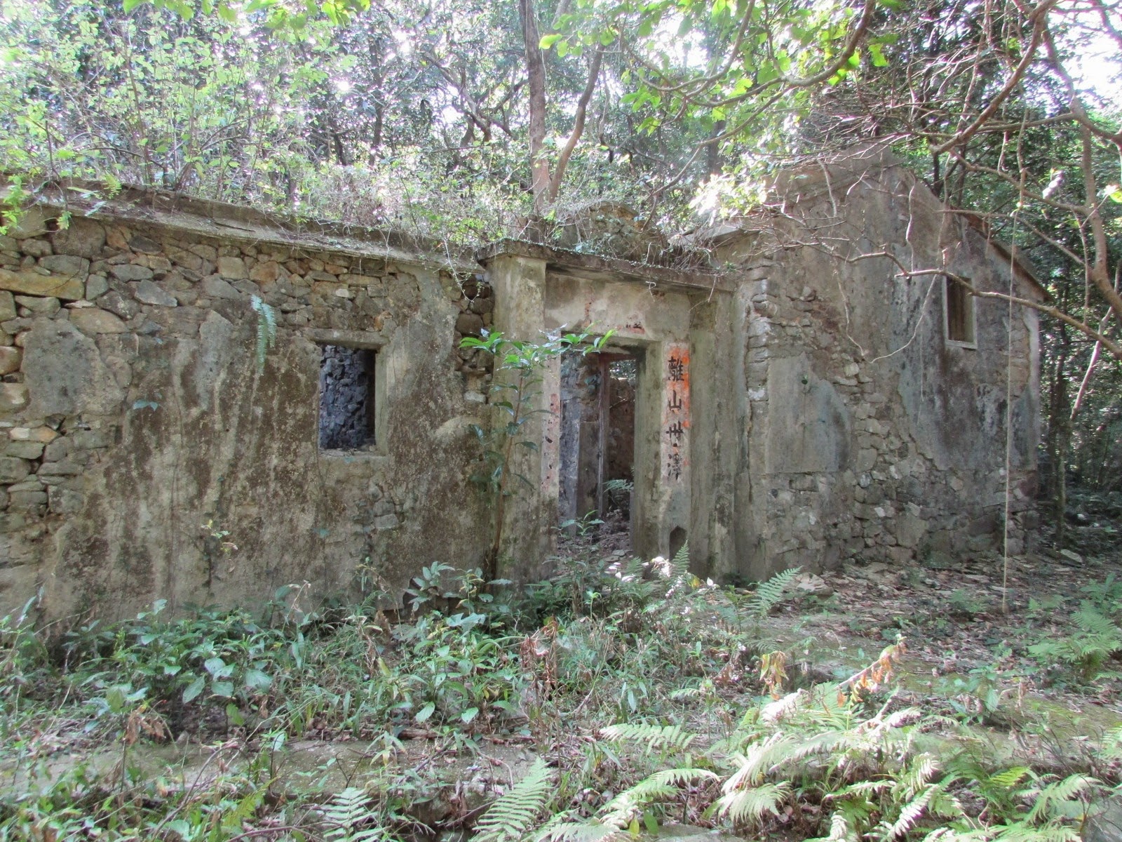 P326-328:另一排廢屋,對聯文字已脫落得七七八八,但仍可估算這是祠堂遺址。
