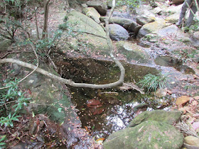 P74-76:瀑下乃烏龜潭。初春時期,石墜下瀑沒有明顯流水,故烏龜潭只是一潭死水。