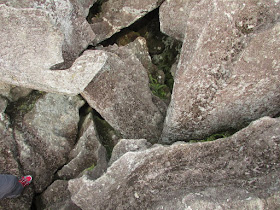 是日相約友人,挑戰全城最大的石林--石壟仔石林。石林位處鹿巢山石壟仔村之上,面積約七萬平方米,海拔330至430米之間,據說那裡原是個懸崖,後來懸崖塌下,碎石散在崖底的山坡上,成為石林,而大部分岩石在長年累月的風化下,石面形成一道道深溝,頗為鋒利,讓人難以站穩其上;因岩石是不規則的疊在一起,故石間亦存在不少深隙,部分位置更深不見底(最少二十米),如有失足,或許「九死一生」,走在那座石林,像穿過幾十個狗牙嶺「一線生機」似的。石林內並無明顯路徑,相當自由,但太自由卻易令人迷失方向,走在其中,必有良好方向感,否則會令你迷失在石間,浪費大量體力。石林內的震憾感及難度遠較相片為高,要不停的手足並用,才可順利登上鹿巢山頂。或許是日天氣濕暖,頗為辛苦,坳仔幸好在本年一月十七日的行程中未能找對石林入口,否則可能在入黑後還困在石林裡。