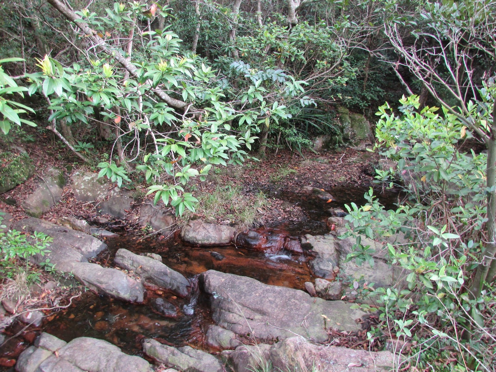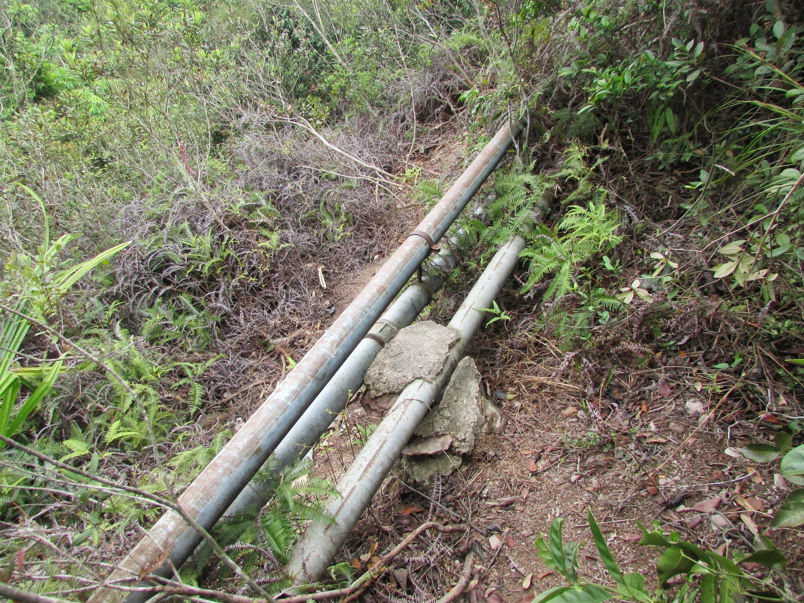 是日採用新路,不經牛角涌下游,改經「水管路」往吉澳供水水塘,然後才下抵紅石門村。該路較為迂迴且崎嶇(不停的穿越一排水管),故荒廢多時,去年底某遠足隊才把此路重新打通。在潮漲時牛角涌下游會被淹沒,該路亦可成為「迷椏走廊」往紅石門村的後備路段。但要留意的是該路較少人踏足,故路況較凌亂,以依靠遠足隊的引路帶為主,我們曾一度錯走了路。