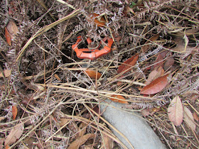 抵達紅石門村,眾人隨即坐在堤壩上,邊欣賞美麗的紅石海岸,邊享用午餐。然而,時候已是不早,大家只停留約十五分鐘,就要各自起程,大隊就再經吉澳供水水塘上環湖徑回程,而坳仔則陪同另一人,續往花籃坑看壺穴,而路上的蜘蛛網同樣不少。是日水位較高,穿過堤壩時又要涉水而行。想不到途中我們竟一度錯走另一小徑,才想起那小徑可直上鹿湖峒,或沿古道經長窩往烏洲塘,但據說兩路已荒廢多時,而在鹿湖峒並沒有找著路口,也許留待年尾才慢慢探索吧。