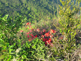 坪墩村是大網仔谷八村中最深的村落,不過是日並無入村,而在旁邊的水壩上太墩。初段為叢林路段,在十字路口先沿「斬竹灣」回走一小段,再轉入小徑上山,斜度亦隨之增加,宜手足並用,途中可望雷打石及大網仔谷的風景。路上得急,加上溫度偏高,頗為辛苦,幸好路邊有一些紅花可供欣賞,順道休息一下。急上約十多分鐘,到達太墩副峰(304米),副峰的三角網測站曾被閃電擊中,頂部脫落,露出鐵柱。主峰就在副峰以南約六百米,適逢日落將近,風景加倍動人,在此大休半小時。下山路段較為崎嶇,故沒等到太陽完全湮沒在馬鞍山群峰後才起步,回到停車場時天色開始轉暗,時間控制得真好。