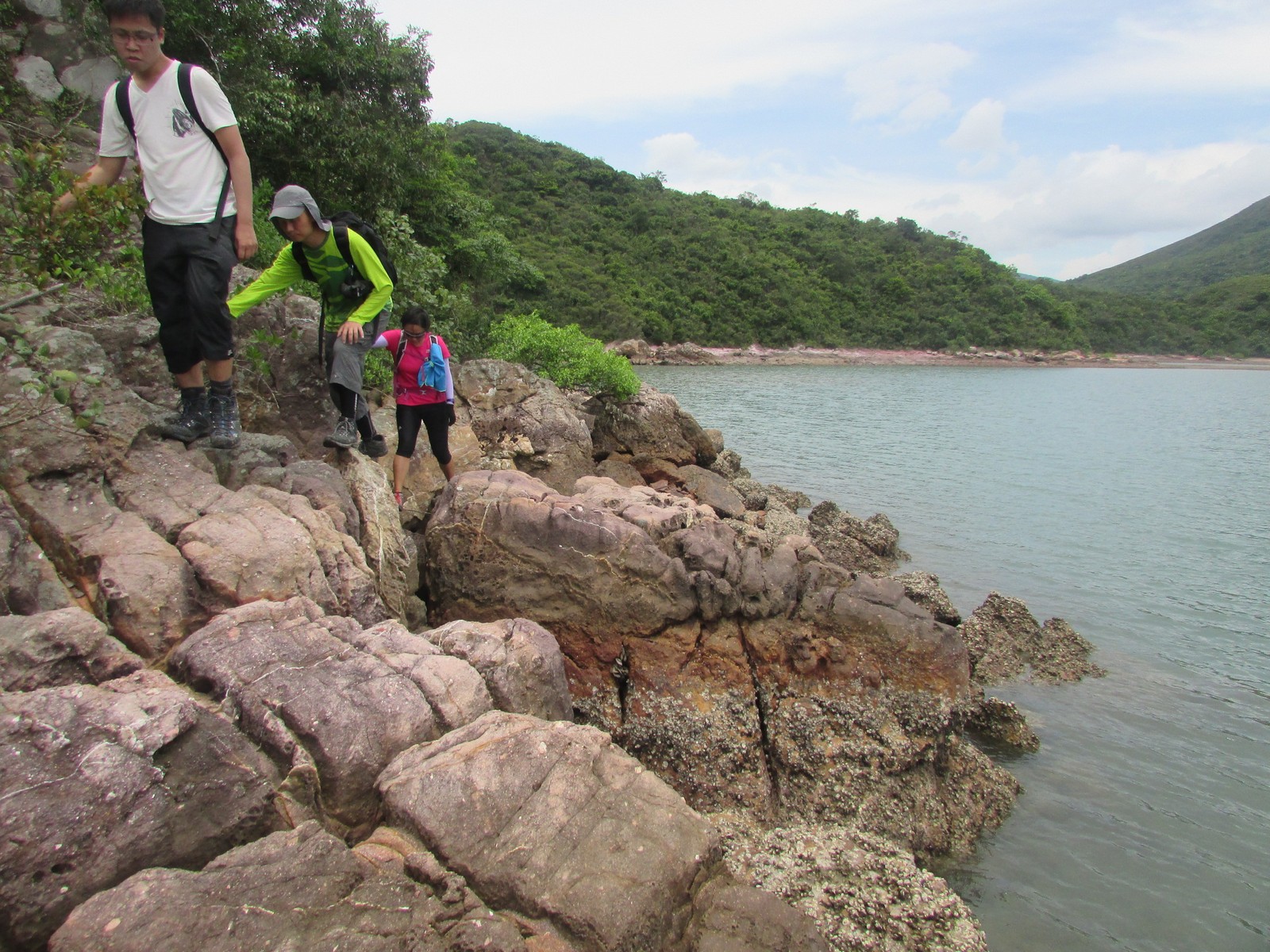 離開馬尿瀑海邊,沿海岸線東走,途經長排頭後繞入北海篤的深灣。篤盡處是一大片淤泥沼,非常吸腳。當腳從淤泥沼抽出時,因吸力太大,把鞋面與鞋底的一小部分「解體」,幸好還能頂住全程。因天氣很熱,大家沿途安排了多次休息。離紅石門越近,岸邊的岩層則變得越紅,但已沒大心情細賞風景,只好如機械人般一步步走著。