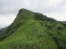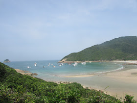 是日初段跟遠足隊,原訂上大枕蓋、田尾山過蠄蟝石頂、西灣山、萬宜東壩回北潭涌完程,並希望遊覽浪茄村,不過大隊臨時改了行程,只往蠄蟝石頂。田尾山一段以灌木叢為主,是個無風地帶,但仍要繼續在烈日下曝曬,實在過於辛苦(穿灌木叢感覺上較登山還要辛苦幾倍),相信往來蠄蟝石頂的路也是如此,故決定只在螺地墩遠觀蠄蟝石頂,然後下走西灣村補給一下,並再在大浪村的士多作第二次補給。兩年前的盛夏,也在悶熱天氣下前遊大浪西灣及鹹田灣,而是日更上了西貢東的四座山頭,無疑是那次行程的「加強版」。