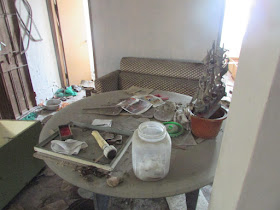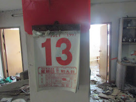 P32-34:大宅的客廳,該屋自1997年7月荒廢至今(日曆已被撕去幾天,地上還有一些碎片)
