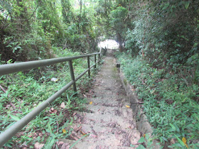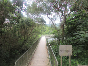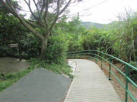 轉入西段越野單車徑,以叢林裡的山腰徑為主,坡度相當平緩(越野單車徑的設計當然不會大上大落吧),急走近一小時,下抵河背水塘,水壩步道呈S字形,頗為美觀。是日小動物相當活躍,不論在上塘礦洞一帶,還是往河背水塘沿途,遇上最少三十尾小蜥蜴,真的沒遇過那麼多,還以為是甚麼異像的先兆。