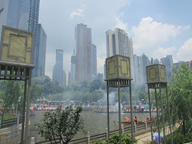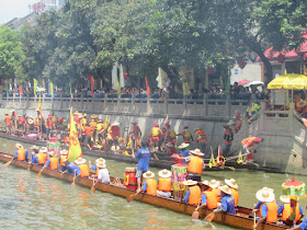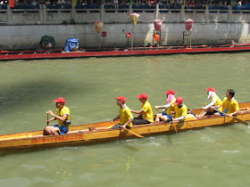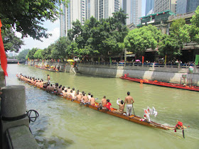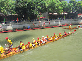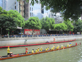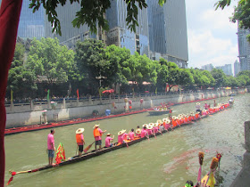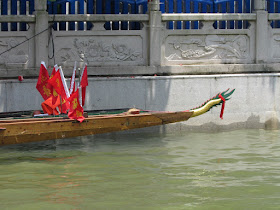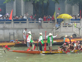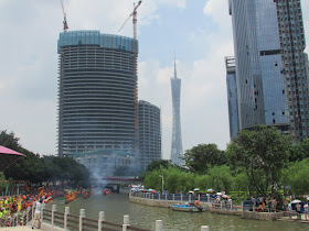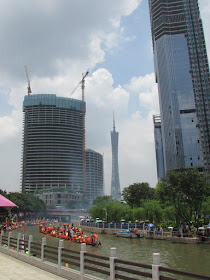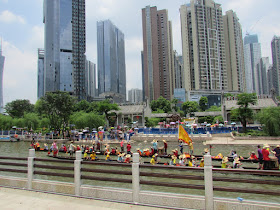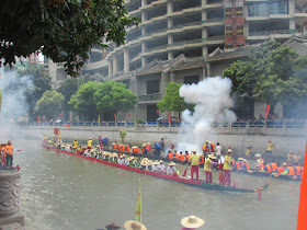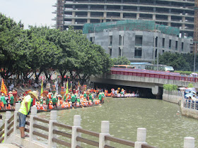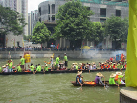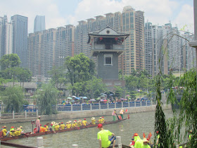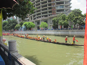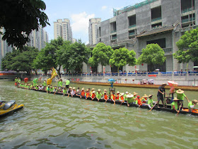 一個月內第二次踏足羊城,是次全程有幸得晴朗天氣相伴。因是日與翌日都是公眾假期,預料會有大量市民離港度假,故早在兩個多星期前就買了直通車票,並於上午十一點趕到獵德村欣賞龍舟招景。廣州市內河涌縱橫,水鄉眾多,故在端午節前後多座水鄉都舉辦龍舟招景活動,匯聚各村的健兒。因而市內的河涌不算太寬闊,故一般不如香城的進行比賽,「鬥快」到終點,而是邊划龍舟邊燃放鞭炮。中午十二點半後,各健兒開始休息,與親友就在宗祠附近享用龍舟飯。