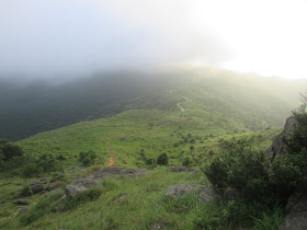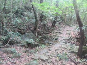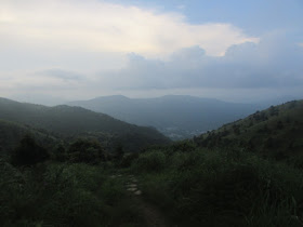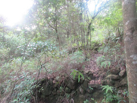 休息幾分鐘後,接小徑上四方山坳,初段明顯且有窄窄的古道痕跡,但接近四方山坳時野草很密,連路胚也難以看見。薄雲中的大帽山,斜陽就在雲間透射,感覺頗為特別,還是不要浪費太多時間賞景,趕緊在一小時內直降至梧桐寨村。初段以山腰徑為主,間中有石板路段,之後可見一明顯支路,都可下抵梧桐寨村,只是其中一道經瀑布群,另一道不經瀑布群而已,但是日仍繼續選前路,希望在有限時間內欣賞到四座瀑布群(井底瀑、中瀑、主瀑及散髮瀑),其中主瀑是境內最高的瀑布,高逾三十米。