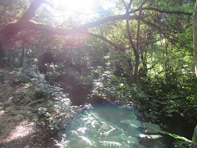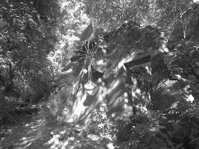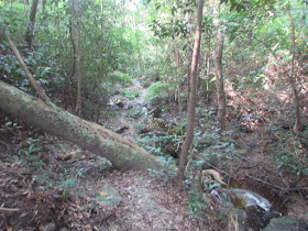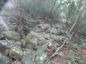 烈陽高照,故走一道較多林蔭的路段為宜,是日就選了八仙嶺北麓的橫七古道,那裡原有四小村(下七木橋及橫山腳上、下村,上七木橋村則稍為偏離古道),但交通不便,早已荒廢,加上深藏林中,屋宅已被野樹嚴重壓毀,而原有的田野則佈在村前廣闊的平地上。是日也走訪八仙嶺以東的荒僻險脊下新娘潭附近--金童脊,路況雖崎嶇,但或許被路旁的樹林阻隔,感覺不太危險。