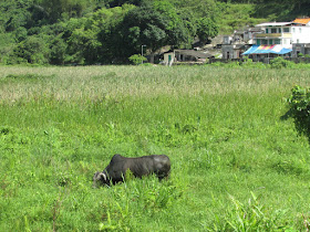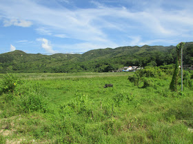 谷裡的大片荒田,有頭黃牛在吃草,陳屋村就在較後方。
