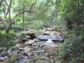 抵達馬路盡頭,右方有一隱蔽路口,在此右轉,沿小徑直下城門水塘畔塘徑。