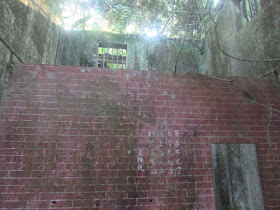 破屋內部與紅磚牆,有前輩在此題詩,把每句首字拼在一起,合成「牛池湖村」: