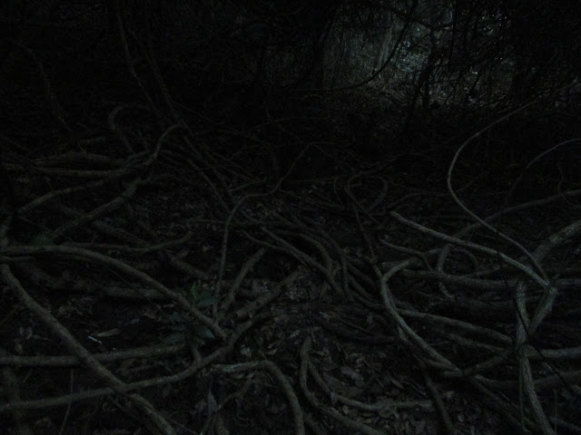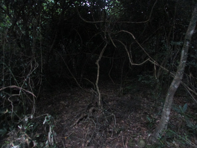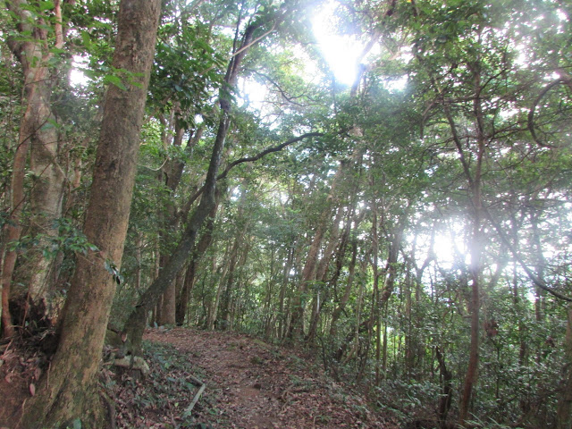再前行幾分鐘到馬路盡頭。前走幾分鐘,見一隱蔽樓梯,乃上「野豬頭」的小徑。穿過山頭的三角網測站,沿崎嶇小徑南下港島徑六段,初段野草頗長,亂石頗多,路胚不太明顯,也幾次差點摔倒;後段引入密林中,裡面滿佈粗藤,亦途經疑似旱澗,路況同樣非常崎嶇凌亂,幸好在入黑前及時接回港島徑六段,然後東走幾分鐘到馬路,再經大潭篤村往大潭篤水塘巴士站作結。由於赤柱遊人很多,加上途經那裡的巴士班次較為疏落,故等了一小時,才能上巴士回西灣河站。