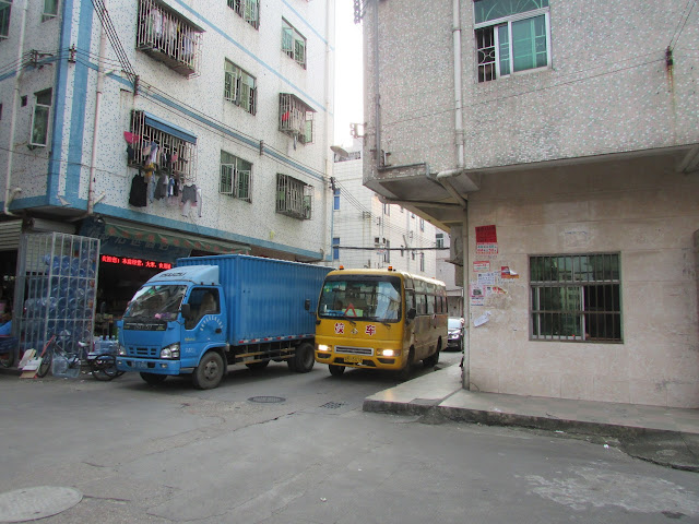 適逢下課時段,校車穿梭在橫街間(註:因調休關係,是日雖為星期日,但本身的假期調整至周五,以方便與抗戰勝利七十周年紀念日形成三天連假):
