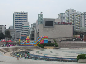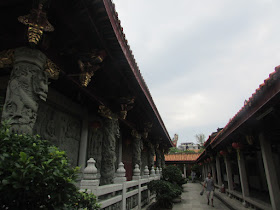 下個景點是潮州市博物館,展出石刻、陶瓷、潮綉等展品,但博物館像是半荒廢狀態,館內的電扶梯停用了,服務台裡一個人也沒有(只有一名保安在另一門旁守著),尤其是地下一層的石刻展廳,氣氛更是很可怕,門前只有兩盞小射燈,射向牆上的文字,腳步聲在廳內清晰的迴盪著,有的展廳也沒開空調,難怪博物館無法吸引遊人。結果只遊覽了十分鐘,就到外面的人民廣場去,廣場裡當然有片大空地及花園,還有個露天劇場、少量牌坊及遊樂設施,帶點地道的風格,不過水池竟然是乾的,傳說中的音樂噴泉,自然沒法展出了。