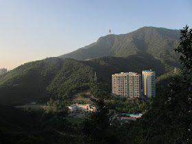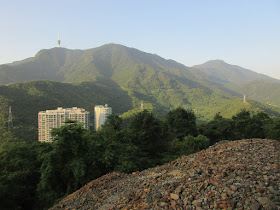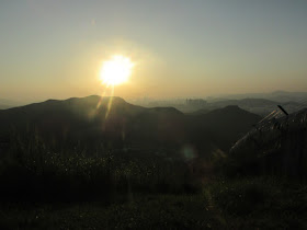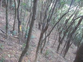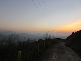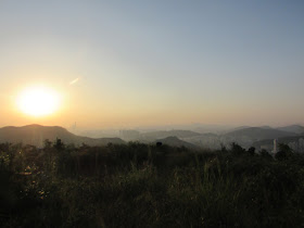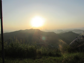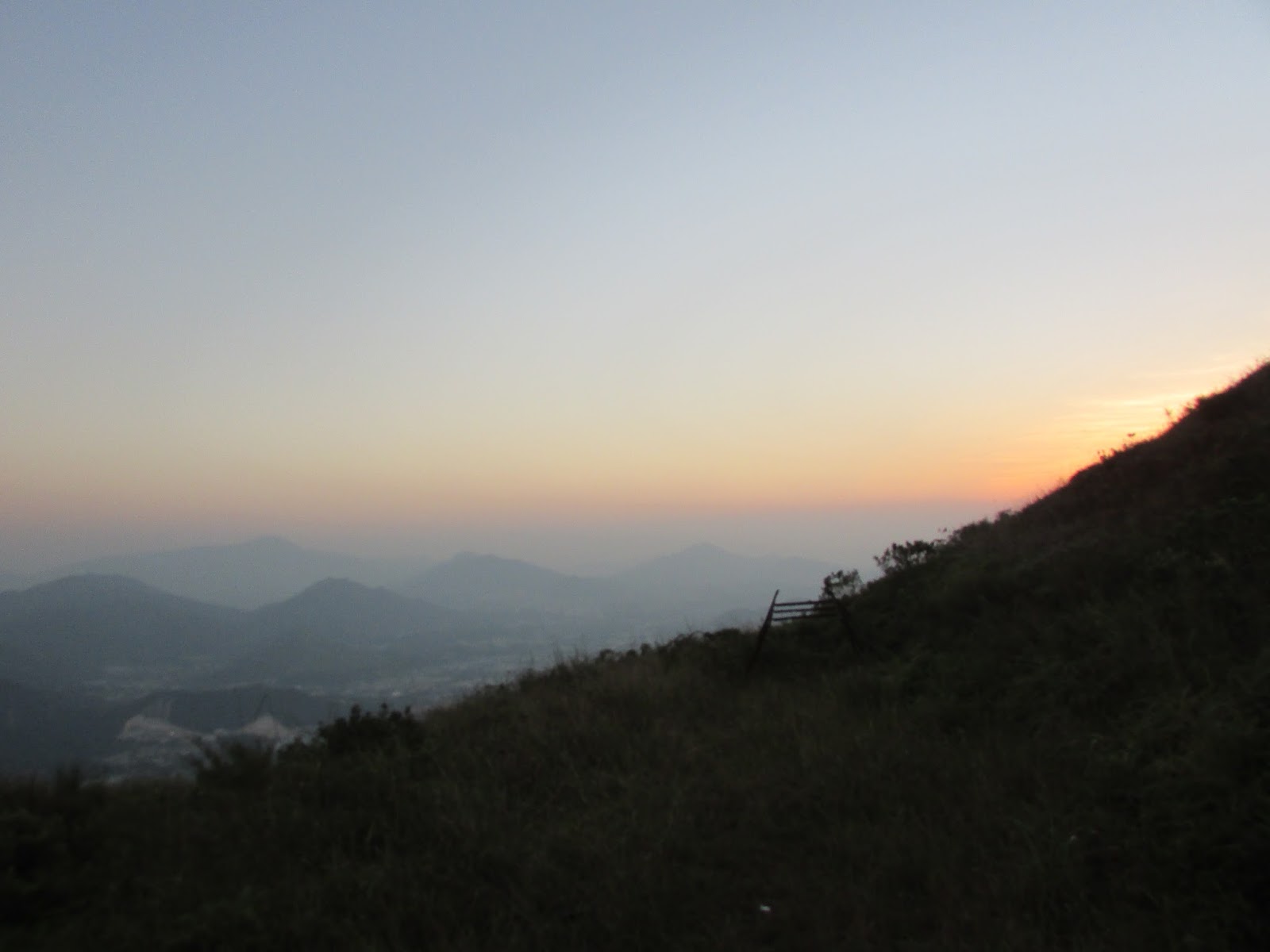 適逢日落時份,夕陽掛在黃茅坑山之上,十分美麗。攝過夕陽後,就沿北脊上紅花嶺。紅花嶺一帶確是有趣,正常的都是較低處的林木較多,但那裡近頂處卻仍是叢林地帶,較低處反而有一些開揚位置,且那裡的樹椏都是彎彎曲曲的。中後段走進林中,時近入黑,林內開始昏暗,就在近頂處的鐵閘附近,忽然聽到近處右方傳來豬嚎,樹叢亦有明顯搖動,但因現場環境頗暗,故未能看清楚那是甚麼東西,林內的豬嚎持續至離開叢林為止。