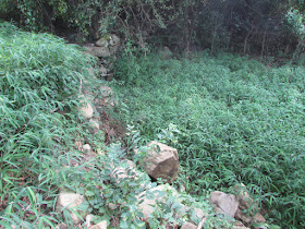 又來到蓮麻坑礦洞了,是次就進入洞內,略攝幾張相後離開。八個月後,再度踏足塘肚古道及連接麥景陶碉堡間的崎嶇山徑。前一晚上網,發現有遠足隊月初才走過此段,故坳仔是日確是放心得多。今年多了人探遊礦洞一帶,現在才是十月,但路況明顯較去年年尾為佳(或因年初有遠足人士墮井喪命的緣故,山界一度對紅花嶺一帶產生戒心,十二月下旬那裡還是滿佈荊棘)。從直升機坪的路口進入崎嶇山徑,廿分鐘後下達半乾的澗道,過澗後就是蓮麻坑村後的荊棘林了。荊棘林裡有無數帶尖刺的野草及藤蔓,在此需非常慢速的前進,且要不時彎身而行,否則很易絆到或碰到藤蔓,繼而弄至遍體鱗傷。亦因路況很亂的關係,如無引路帶帶領,是極易迷路的。在荊棘林及荒田裡仔細的辨認路向,穿插了半小時就到塘肚山村的三層高廢屋。