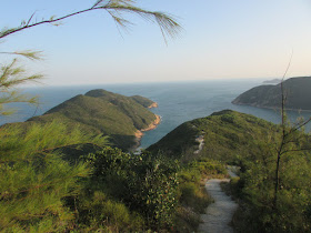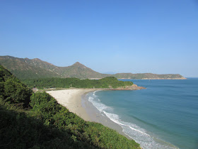 再翻過一座山腰往西灣,山腰近高處正是欣賞鹹田灣、蚺蛇尖及長咀的最佳之地,其畫圖更是西貢區以至全城的一處重要標記,眾人無一不留影。陽光下的沙灘,配合蔚藍的天空,十分動人。來到西灣村,小休一會,然後經吹筒坳直上西灣山(314米)。上西灣山途中,仍有不少遊人迎面而至,包括某隊穿上整齊隊衣的遠足隊,以及國內同胞。在山頂旁的涼亭,地上垃圾處處,為何不順道把垃圾帶走呢?別太依賴清潔工人了,工人不是天天都上山的。