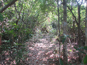 由北潭坳出發,步至四叉路口,先沿「黃石碼頭」方向下走一段,在小溪處接入一道隱蔽小徑往東心淇,沿途都是有點破爛的水泥徑。急步走約廿分鐘,就到東心淇村,村裡很靜,只有屋子約七八所,包括一所活動中心,較高處還有兩所較西班牙式丁屋,似乎在特別日子才有居民回來度假。是日風勢較大,浪花不時濺到碼頭上,且在村裡無甚可賞,故只在逗留了五分鐘就離開,沿東心淇山(165米)接麥徑。東心淇山以叢林或密林路段為主,僅有少量地方可賞風景。走著走著,就在山頂不遠處,左方近處的林中忽然傳來強烈的腳步聲及叫聲,然後迅速的向遠處逃去,相信是野豬,幾個月前有人亦在相同位置遇上。這裡山頭不大,遊覽半島時還是要加倍警覺。