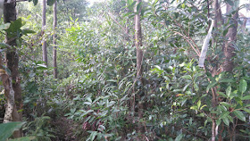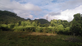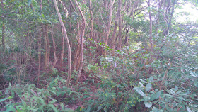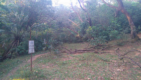 回到溪邊的路口,朝北上走,此時再看GPS地圖,對覓路幫助不大。在灌木叢中細看引路帶,穿過墳區後一直沿不明顯的山脊上行,不久後就到391山頭,在山頭上並無景可賞,只是停下來略作補充水份。雖然植被茂密之餘支路且多,但路胚仍較前周六明顯為佳,故不用走得異常辛苦。忽然看見上衣黏著一些鬼針草種子,在這季節穿越密林,遇到此情況或許在所難免,幸好是日所穿褲子不易被種子黏附,不致使自己再次成為「嘩鬼」。經過391山頭後不久,小徑趨於偏西方向,沿最明顯的路前行,很快便引進林中。途中不時有其他隱蔽的路口,但一直沿北走,不久後接入煤氣管道7號柱附近。此時忽然下著一陣微雨,但抬頭一看,頭頂處還是一片藍天,究竟雨從哪裡來?