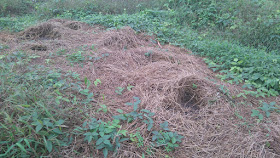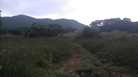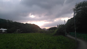 到達沙螺洞時先轉往李屋的小徑,那裡要在田野間穿插。早年沙螺洞曾是越野車馳騁之地,在田野上壓了很多車轍,至今痕跡仍很清楚,故要在車轍間細心覓路,其間看到田上有很多野豬翻土的跡象,也有無數用草堆成的巢穴(讓野生動物臨時棲身?)。期間又下一場雨,雨勢也不算小,想起了兩日前是「黑色星期五」,香城似乎對「黑色星期五」沒大應驗(不過剛過去的那天股市顯著下跌,而法國更發生了恐襲事件,有近二百人罹難,先說一聲RIP),但好像每次「黑色星期五」之後的星期日天色都不佳,不是天陰大霧就是下雨,某次更遇著罕見的冬季暴雨,適逢那天還要露營,顯得十分狼狽(莫非15號星期日對戶外活動的人來說是不好的日子?)。