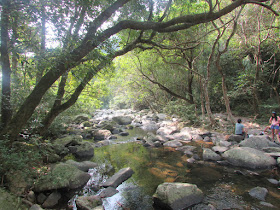 依水泥徑走五分鐘到梅子林村,村裡已無人住,但村民仍把祖屋妥善修葺,故未如其他廢村般以頹垣敗瓦為主。梅子林至荔枝窩是緩緩下降的水泥路,在路上很開心的衝下去,只用了六分鐘就到荔枝窩,到達時正好午飯時間--不過那裡沒有飯供應,在村中的露天士多點了細雞粥和豆花,盛惠廿四元,士多另有供應炒麵、糖水、鹹雞以至盆菜(但需預訂)。村裡的荒田,其中一片已在去年起復耕,其餘的荒田近來也正展開復耕工程。