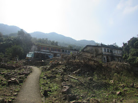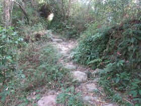 本來想走東北脊下三椏村,不過最後走了北脊落蛤塘,算了。沿一段間中頗為陡斜的小徑下行,中後段是樹林地帶,有很多亂叢及野豬出沒的跡象,亦會經過疑似乾澗的路段。大半小時後到蛤塘村,只有一兩戶人家在居住,屋旁有些果樹,未知戶主的果實及財物是否多次被缺德遊人取去,結果戶主就要用狠毒的文字詛咒偷東西的遊人。
