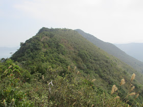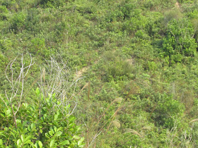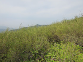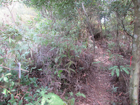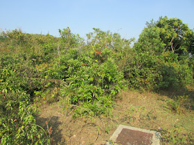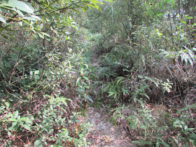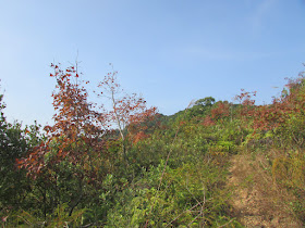 在三椏公廁鐵欄後的小徑上牛屎湖山,中段的一處開揚位置有個隱蔽路口在右邊,那是往橫排山的路。與橫排山有關的遊記並不多,但據說望向三椏灣的景觀卻十分美麗,是日就試一走。走了一段,野草相當茂密,僅間中可見路胚,雖然前方山崗還是可見小路,不過為免冒險,加上在烈日照射下更有悶熱的感覺,還是放棄續走,留待日後野草進一步枯萎時才再探,不過因路胚不明顯的關係,返回往牛屎湖的小徑時還真的不容易。