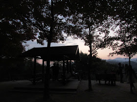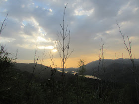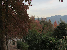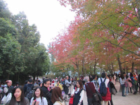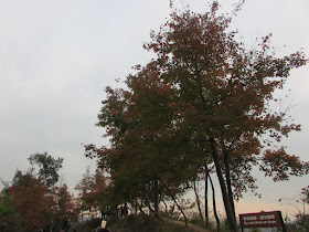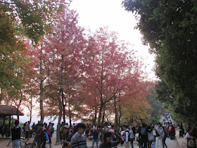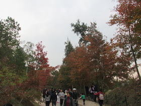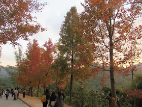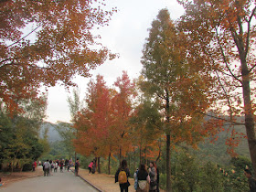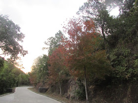 沿馬路緩緩上斜,漸見楓香樹蹤影,其中有兩處楓香林規模較大,故聚集了很多遊人。雖然已屆日落時分,但遊人還是絡繹不絕,當中以情侶為主,不少人帶同「自拍神棍」留影,有部分更帶同愛犬賞楓,期間「鹹蛋黃」徐徐在山後落下,相當美麗。今年秋季天氣明顯較去年同期溫暖,所以極紅的楓香樹還不算多,帶紅葉的樹木數量也相對少(去年賞楓日是12月20日,只晚了一天,但當時不少楓香葉已變極紅)。