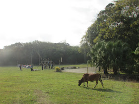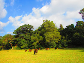 又是青龍頭起步,又是經水管路上圓墩營,不過一進營區,就有約十頭黃牛在大草地吃草,在陽光照射下甚為詩情畫意。圓墩營前屬圓墩村的一部分,海拔約220米,不過交通不便下,遷至山下的青龍頭,而古村屋則獲保留。
