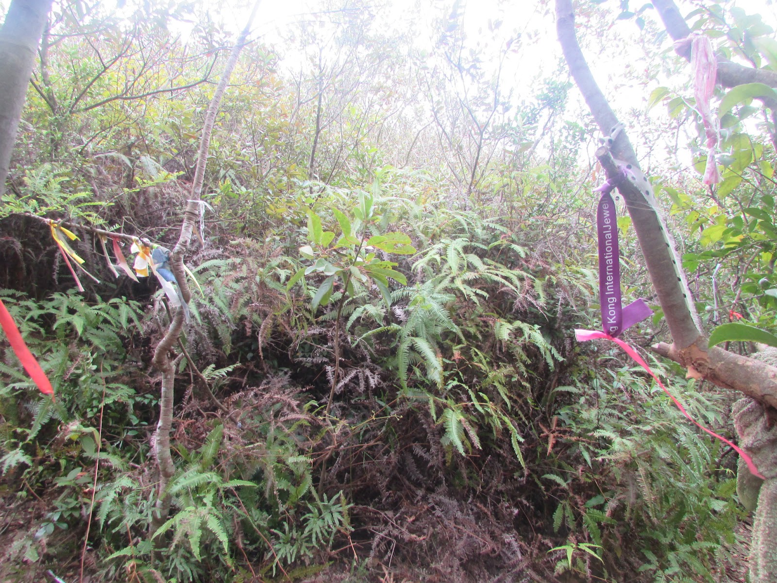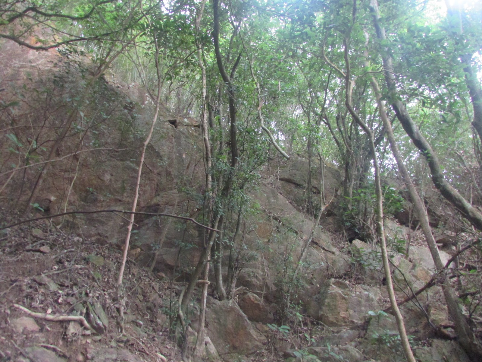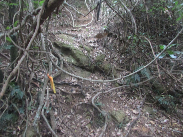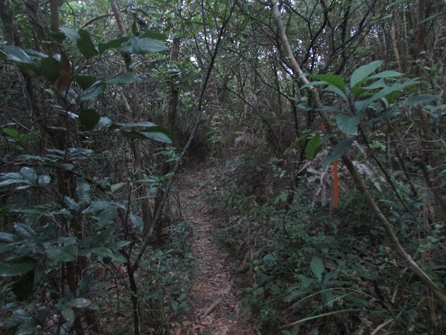 在小滘坳轉入「跌死狗」南面山腰路過鳳凰笏頂,然後在鳳凰笏頂一帶(東經114度18分23秒至33秒)覓路經山脊下鳳凰笏。不過,找著找著仍沒看到明顯的下山路口,只下了幾步就被樹枝重重遮蓋,但翻看過往遊記、相片,加上地政總署的航拍圖,相信幾年前有人到訪過之餘路況還是明顯,為何幾年間山徑入口會那麼快消失呢?在全球暖化的大趨勢下,植物生長似乎越來越旺盛,其他較少人走訪的山徑,幾年後很可能要消失了。