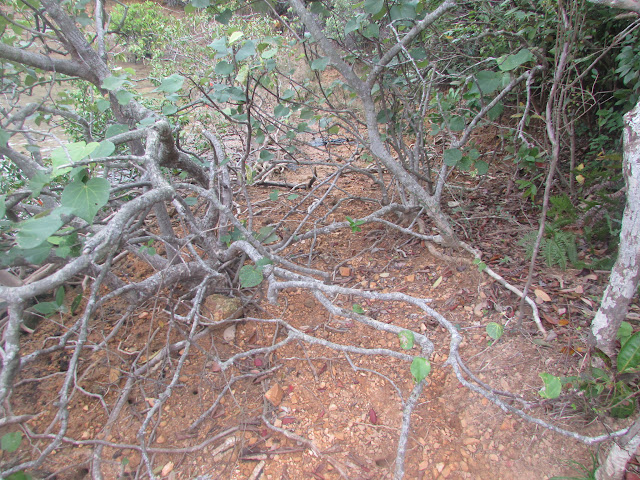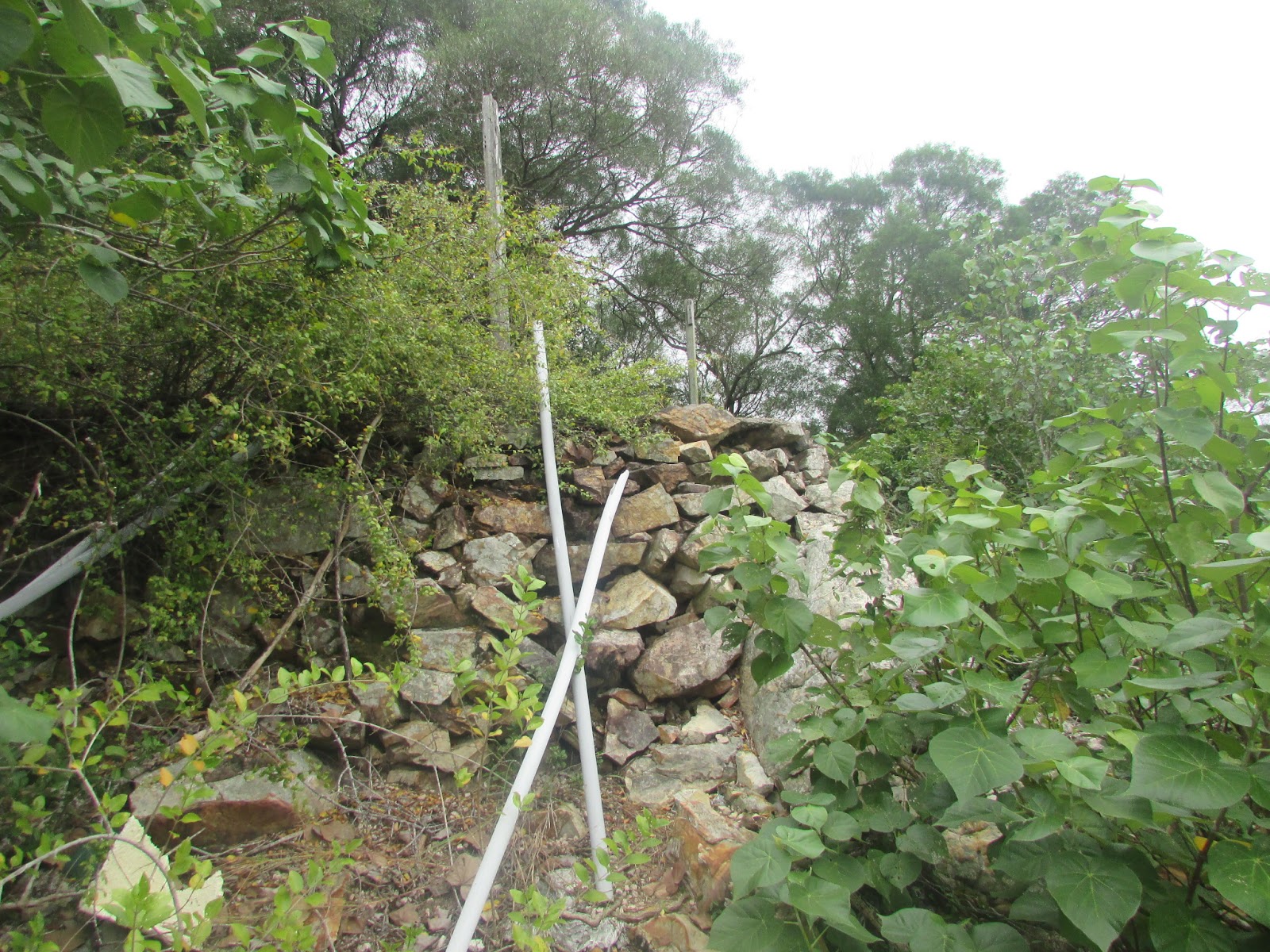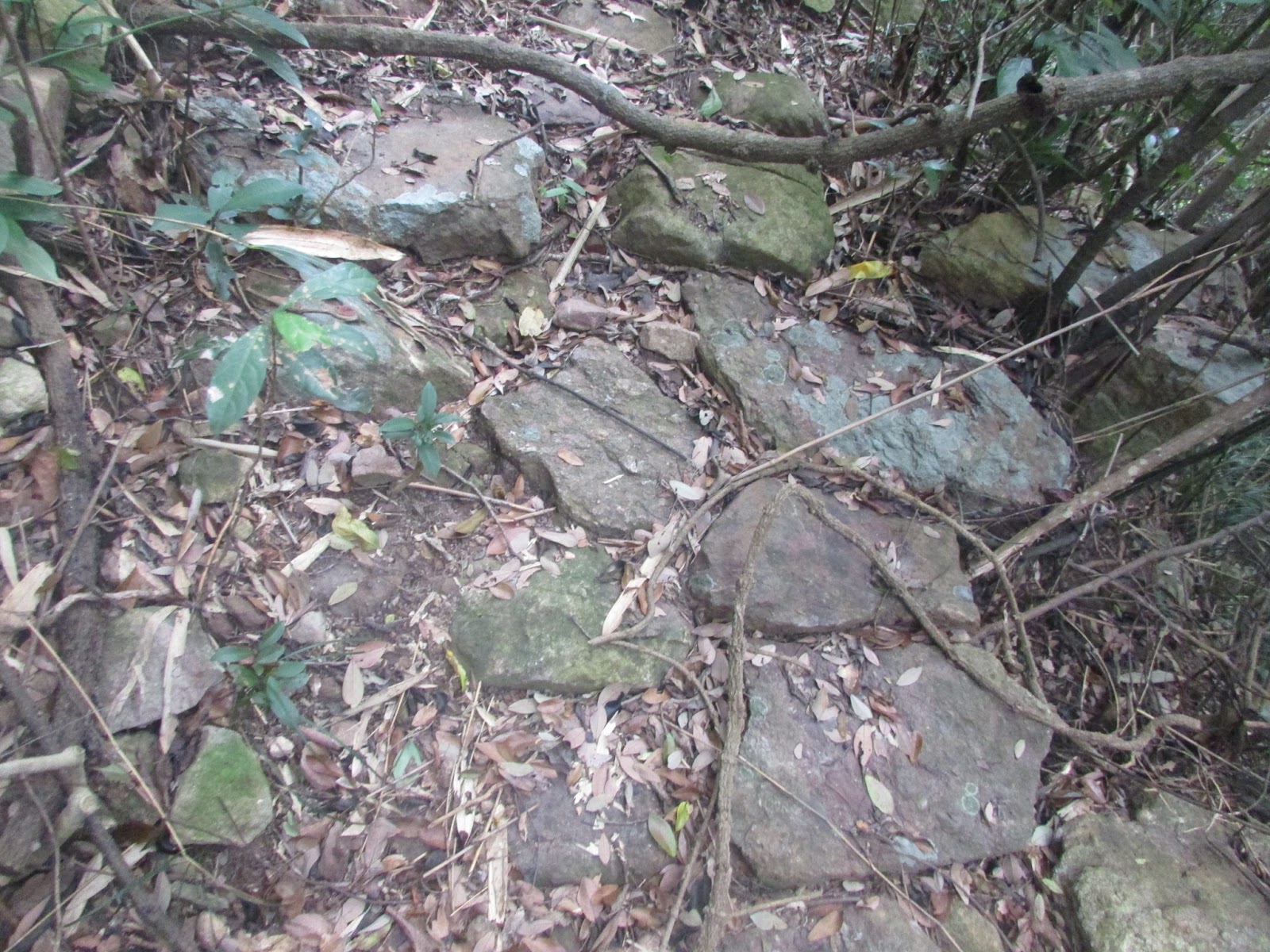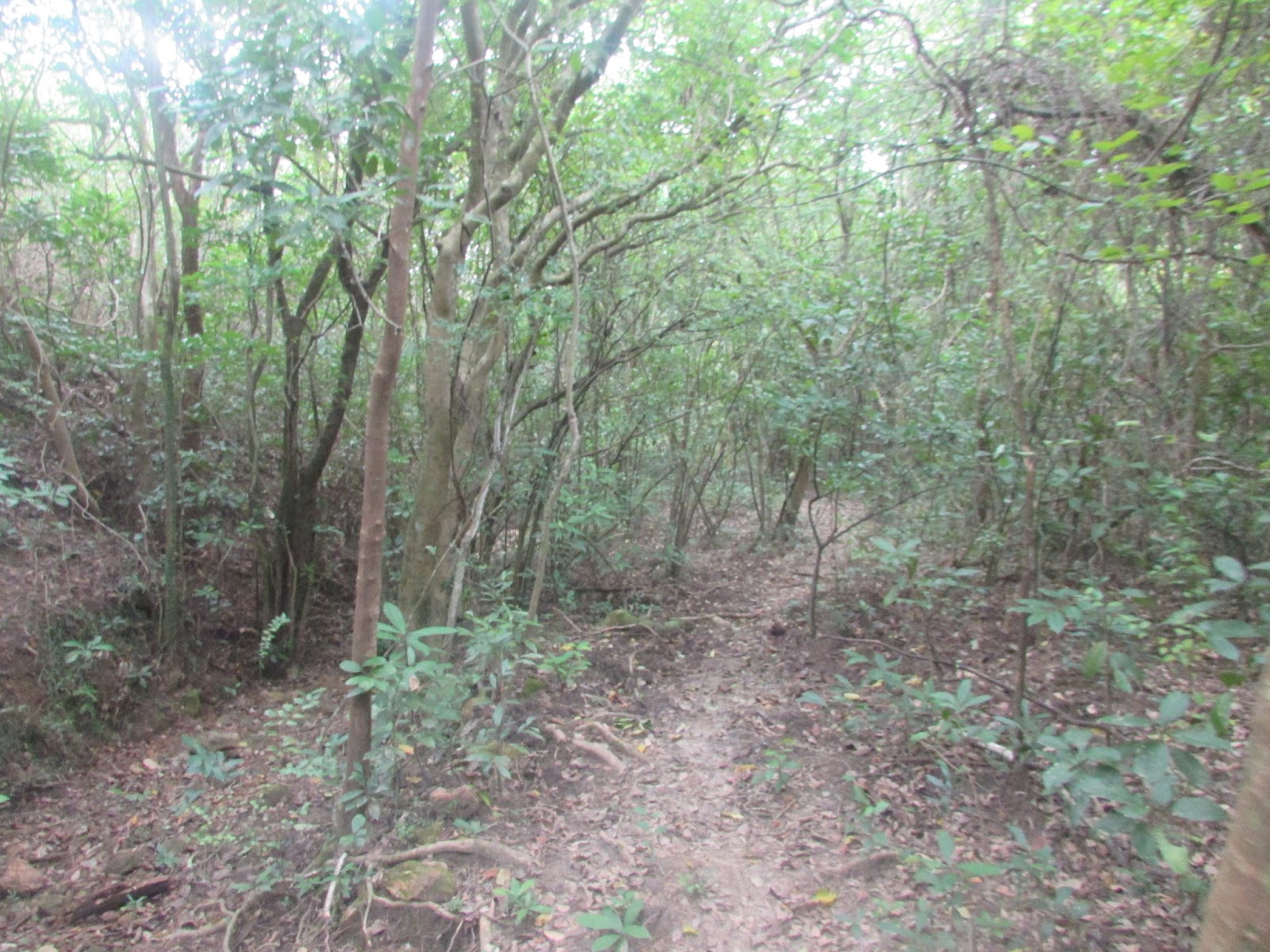 在小滘坳轉入「跌死狗」南面山腰路過鳳凰笏頂,然後在鳳凰笏頂一帶(東經114度18分23秒至33秒)覓路經山脊下鳳凰笏。不過,找著找著仍沒看到明顯的下山路口,只下了幾步就被樹枝重重遮蓋,但翻看過往遊記、相片,加上地政總署的航拍圖,相信幾年前有人到訪過之餘路況還是明顯,為何幾年間山徑入口會那麼快消失呢?在全球暖化的大趨勢下,植物生長似乎越來越旺盛,其他較少人走訪的山徑,幾年後很可能要消失了。
