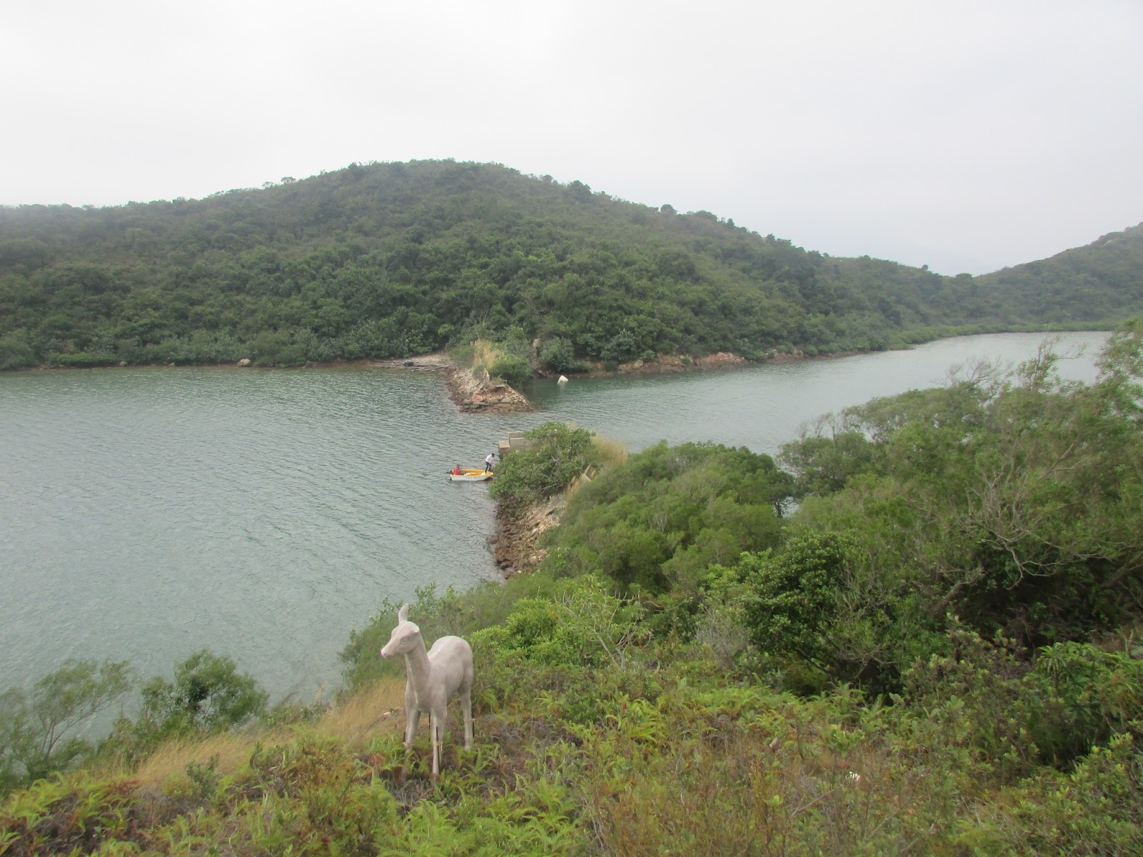 經主壩、副壩一帶的馬路入船灣淡水湖郊遊徑山路,在C2625標距柱附近的山坳有小徑過老虎笏,西面的灣篤停著一些已荒廢遊船,之後沿海邊「綑」而東面的養珠場附近,路邊有不少紅樹林生長,初段岸邊的路段還是明顯,不過因潮漲關係,最後要涉水而行,水深更是及膝。到東面的灣篤,看到一座廢屋遺址,只餘不到半壁牆身,未知本身的養珠場是否已被拆掉,所以再無往前細探,最後翻看地圖,發現我們原來根本沒到過養珠場。笏中的漁排還有人住,當我們在岸邊拍攝時,漁排裡的狗隻不停地吠叫。另外岸邊及類近的山坡上發現有些馬、羊等動物雕塑,認真有趣。